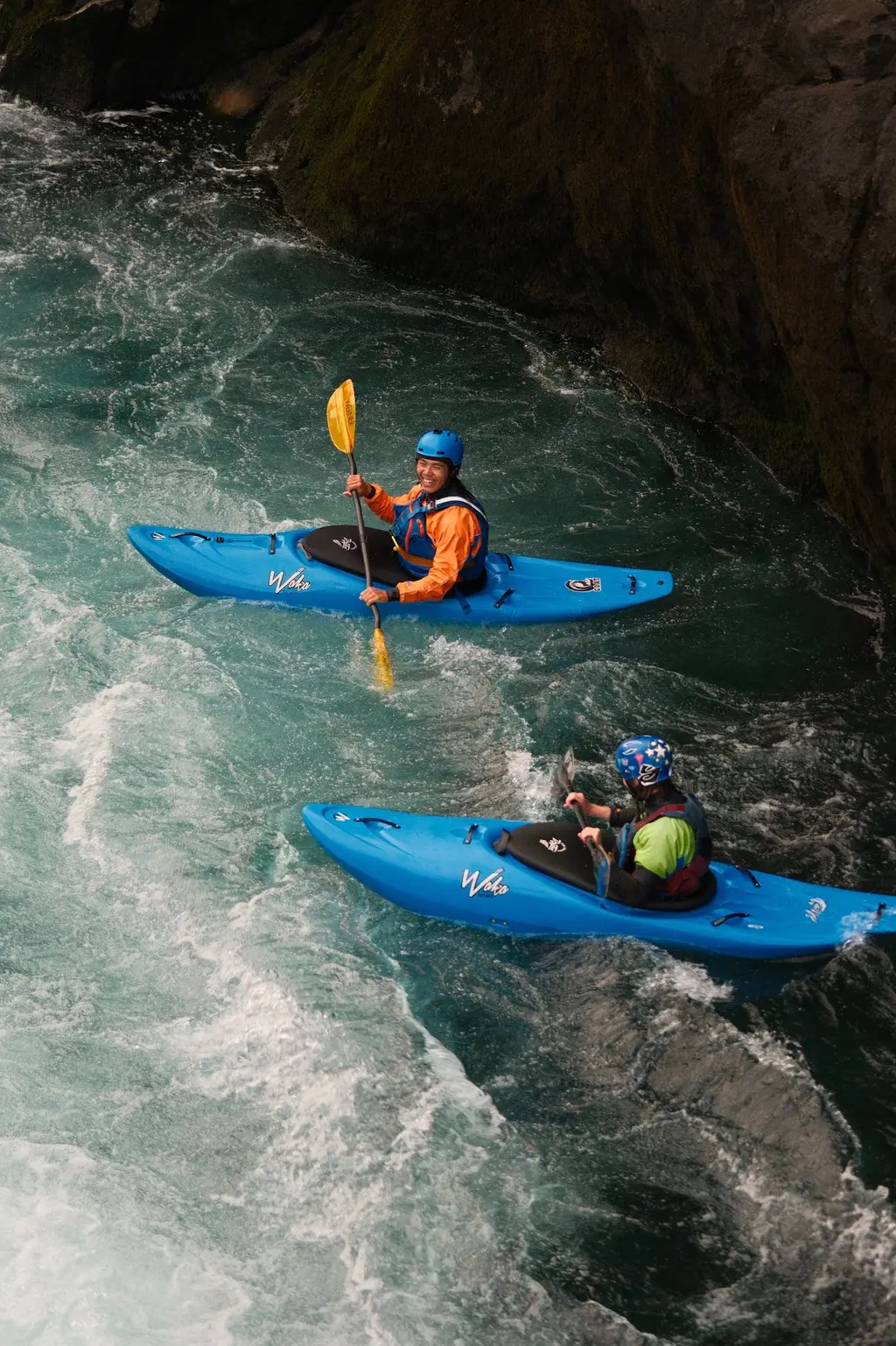 After some sprayskirt shenanigans from Taya, we were all on the river by 10:30, boogying down some wide shingle-bed rapids. The sun was shining and the surf waves were plentiful. We also were lucky enough to see many whio throughout the entire day 🦆. Some of the favourite rapids were a horse-shoe wall rapid, and a rapid with a 4 metre wide (!) green surf wave. There was also some good practising of boofing over pour-over rocks (but not by Ben in the welded boat of course…)